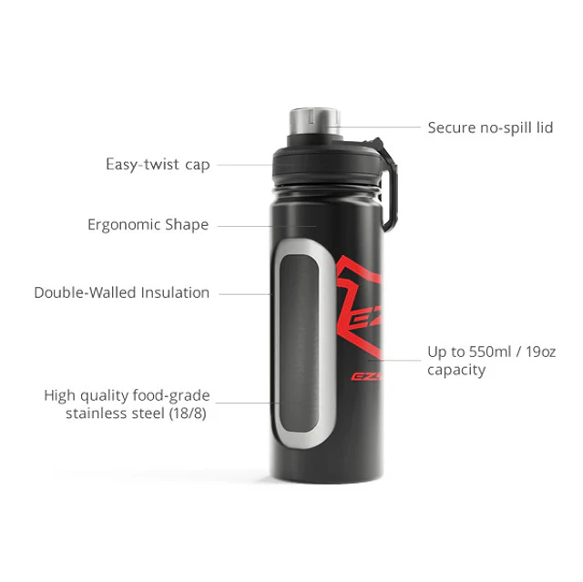 The EzyDog Insulated Water Bottle keeps your hot drinks hot and cold drinks cold, thanks to its double-walled vacuum body made from 304-grade stainless steel - known for its durability and longevity. The main lid twists on and off, making it easy to fill with your favorite beverage. The drinking spout is also protected by a convenient twist lid.
